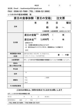 斎王弁当 「斎王の宝箱」2,000円(税込・要予約) ![]() 「斎王弁当」1,600円(税込・要予約) ※お茶付きです。原則として4食以上、4日前までのご注文です。 ※当日の変更、キャンセルはできません。 予約・お問い合わせ いつきのみや歴史体験館 Email : itsukinomiya319@gmail.com(メールでのご注文お願いします) TEL 0596-52-3890 FAX 0596-52-7089 bento-order.pdf へのリンク ![]() |